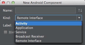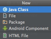 3.新建文件方式的不同,右鍵選擇New或Command+N后出現新建菜單,類型有Java Class,也就是一般的java類,File就是普通文件,Package就是建包,值得注意的就是Android Component,它直接提供了Android中基本組件的創建。