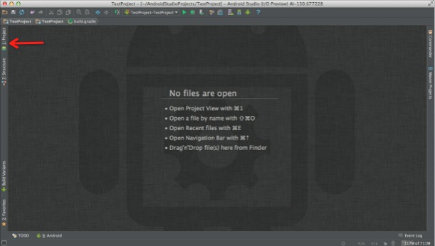 新建工程完畢后就進入了Android Studio主界面。第一次進去可能如下圖所示什么也沒有,點擊箭頭所示按鈕展開目錄結構,