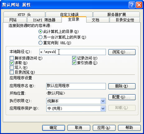 接下來在注主目錄中選擇一個自己硬盤上面的文件夾存放網站(這個目錄就是我們上面說的在e盤建立的目錄),選中讀取、寫入