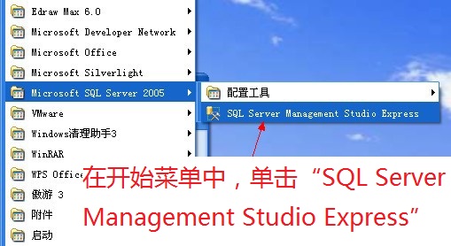 在開始菜單中,找到“Microsoft SQL Server 2005 ”-->“SQL Server Management Studio Express”單擊