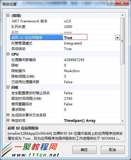 找到IIS應用程序池,“設置應用程序池默認屬性”->“常規”->”啟用 32 位應用程序”,設置為 True。