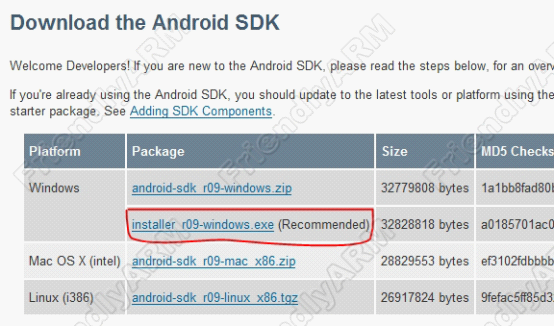 首先,前往從網(wǎng)站http://developer.android.com/sdk/獲取Windows 平臺(tái)的 最新的Android SDK 套件,下載完成會(huì)得到一個(gè)安裝文件,下載頁面如下圖所示,請下載紅色方框框出的文件: