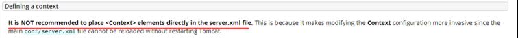 之所以不推薦這種方法,這是因為在Tomcat服務器的說明上已經表明這種方法需要經常性的修改server.xml文件,而每次修改都需要重啟服務器