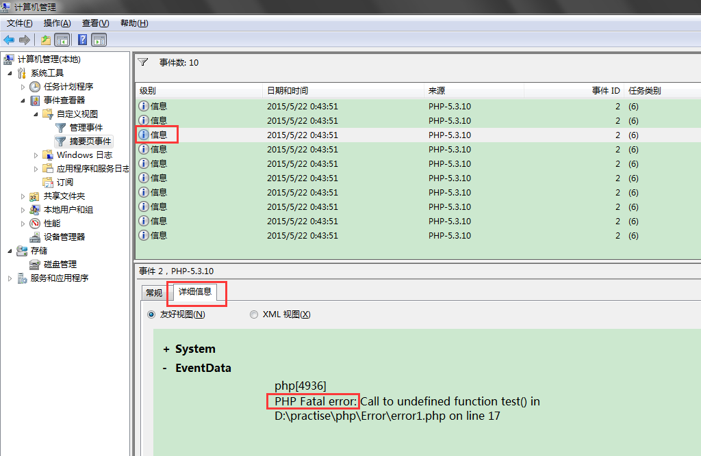 1 2 3 4 5 6 7 8 9 10 11 12 13 14 15 16 <?php //關閉錯誤顯示 ini_set('display_errors', 0); //開啟錯誤日志功能 ini_set('log_errors', 'on'); //設置錯誤日志的路徑 ini_set('error_log', 'syslog'); //顯示所有錯誤 error_reporting(-1);在事件查看器的警告信息中也能看到日志: