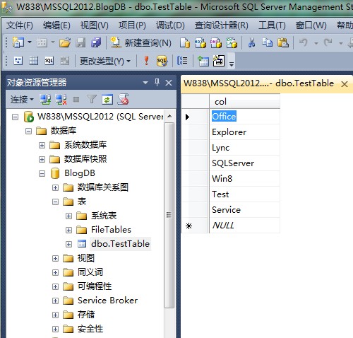 我新建了一個名為BlogDB的數據庫,里面只有一張表TestTable,表中有一些雜亂的測試數據。