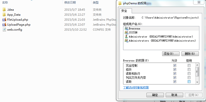 好吧,是權限問題,最簡單的解決辦法是把C:UsersAdministratorPhpstormProjectsphpDemo的權限設成Everyone, 并允許完全控制: