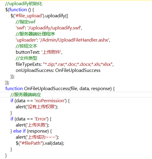 1 2 3 4 5 6 7 8 9 10 11 12 13 14 15 16 17 18 19 20 21 22 23 24 25 26 27 28 //uploadify初始化 $(function () { $('#file_upload').uploadify({ //指定swf 'swf': '/uploadify/uploadify.swf', //服務(wù)器端處理程序 'uploader': '/Admin/UploadFileHandler.ashx', //按鈕文本 buttonText: '上傳附件', //文件類型 fileTypeExts: "*.zip;*.rar;*.doc;*.docx;*.xls;*xlsx", onUploadSuccess: OnFileUploadSuccess }); }); function OnFileUploadSuccess(file, data, response) { //服務(wù)器端響應(yīng) if (data == 'noPermission') { alert('沒有上傳權(quán)限'); } if (data == 'Error') { alert('上傳失敗'); } else if (response) { alert('上傳成功~~~'); $("#filePath").val(data); } } uploadify?