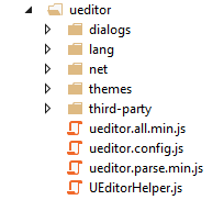 index.html 是一個示例文件、可以刪去,ueditor.config.js中是一些富文本編輯器的設置,建議不要改動,可以在頁面中引用的時候設置,如果所有頁面都需要設置可以寫在一個js文件中,dialogs是在文本框中點擊按鈕時用到的一些彈出框效果,lang文件夾下是語言相關的設置,目前只有中文與英文,themes文件夾下是一些樣式,third-party文件夾下是一些第三方的插件,有代碼高亮,截屏等