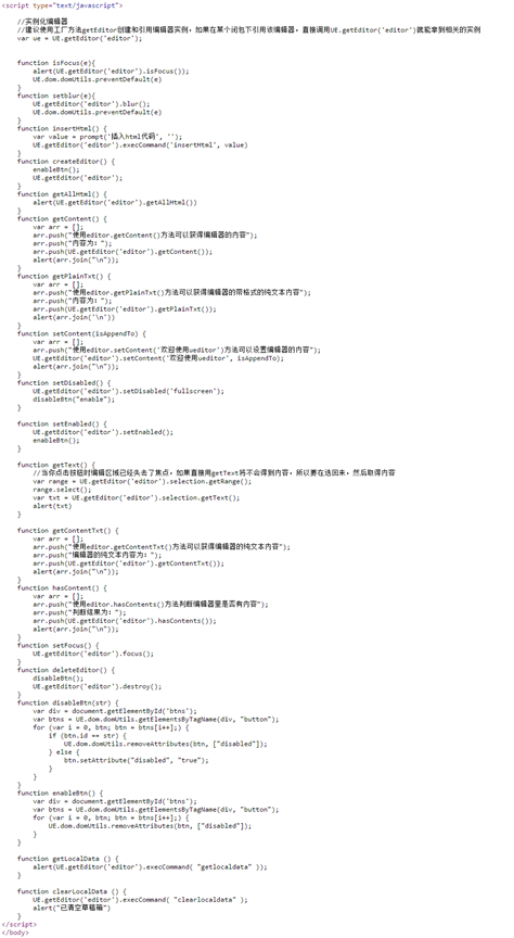 1 2 3 4 5 6 7 8 9 10 11 12 13 14 15 16 17 18 19 20 21 22 23 24 25 26 27 28 29 30 31 32 33 34 35 36 37 38 39 40 41 42 43 44 45 46 47 48 49 50 51 52 53 54 55 //實例化編輯器 //建議使用工廠方法getEditor創建和引用編輯器實例,如果在某個閉包下引用該編輯器,直接調用UE.getEditor('editor')就能拿到相關的實例 var ue = UE.getEditor('editor',{autoHeightEnabled: false}); function isFocus(e) { alert(UE.getEditor('editor').isFocus()); UE.dom.domUtils.preventDefault(e) } function setblur(e) { UE.getEditor('editor').blur(); UE.dom.domUtils.preventDefault(e) } function insertHtml() { var value = prompt('插入html代碼', ''); UE.getEditor('editor').execCommand('insertHtml', value) } function createEditor() { UE.getEditor('editor'); } function getAllHtml() { return UE.getEditor('editor').getAllHtml(); } function getContent() { return UE.getEditor('editor').getContent(); } function getPlainTxt() { return UE.getEditor('editor').getPlainTxt(); } function setContent(isAppendTo) { UE.getEditor('editor').setContent('', isAppendTo); } function getText() { //當你點擊按鈕時編輯區域已經失去了焦點,如果直接用getText將不會得到內容,所以要在選回來,然后取得內容 var range = UE.getEditor('editor').selection.getRange(); range.select(); return UE.getEditor('editor').selection.getText(); } function getContentTxt() { return UE.getEditor('editor').getContentTxt(); } function hasContent() { return UE.getEditor('editor').hasContents(); } function setFocus() { UE.getEditor('editor').focus(); } function deleteEditor() { UE.getEditor('editor').destroy(); } function getLocalData() { alert(UE.getEditor('editor').execCommand("getlocaldata")); } function clearLocalData() { UE.getEditor('edit