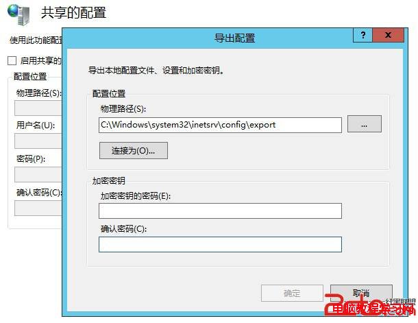 2、進(jìn)入“共享的配置”后單機(jī)右上方的“導(dǎo)出配置”選項(xiàng),選擇導(dǎo)出配置文件的物理路徑,然后設(shè)置一個(gè)密碼,密碼必須是包含數(shù)字、符號(hào)、大小寫(xiě)字母組合并且至少為8個(gè)字符長(zhǎng)的強(qiáng)密碼,確定導(dǎo)出后會(huì)在你導(dǎo)出配置文件目錄下生成administration.config、applicationHost.config和configEncKey.key共3個(gè)文件,這3個(gè)文件就是我們備份的IIS站點(diǎn)配置信息文件。