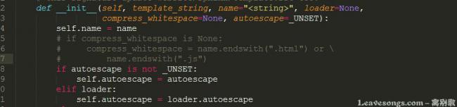 復制代碼 代碼如下:def __init__(self, template_string, name="<string>", loader=None, compress_whitespace=None, autoescape=_UNSET): self.name = name if compress_whitespace is None: compress_whitespace = name.endswith(".html") or / name.endswith(".js")其中有個compress_whitespace參數,當name(模板地址)是以.html或.js結尾的時候,將compress_whitespace為真。
