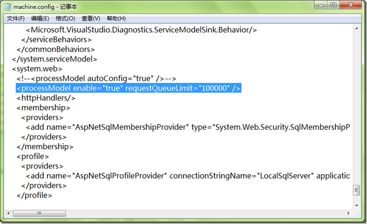 4、將 processModel 元素替換為以下值:<processModel enable="true" requestQueueLimit="100000" />