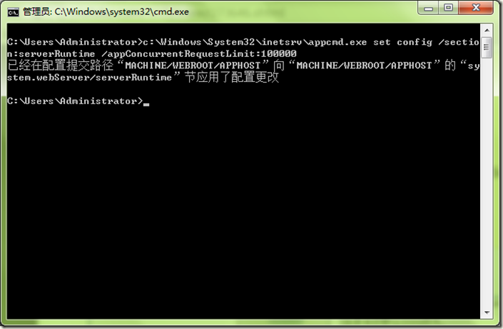 c:/windows/system32/inetsrv/appcmd.exe set config /section:serverRuntime /appConcurrentRequestLimit:100000