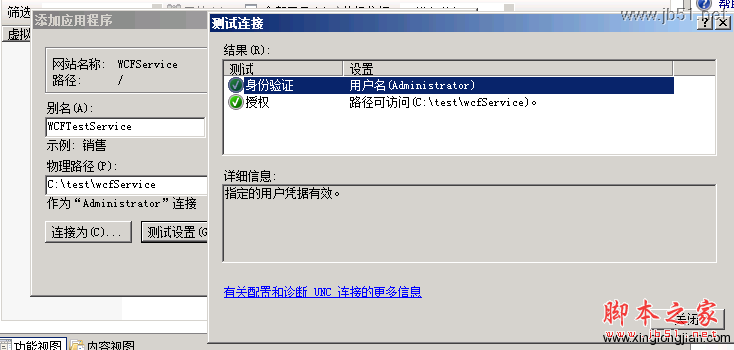 在II7種部署WCF服務,在“應用程序”頁中點擊右側的“添加應用程序”項,添加完內容后,點擊“測試設置”時報出如下異常: