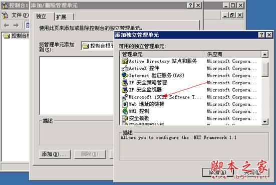 3. 安裝完成后,打開mmc控制臺,添加管理單元。選擇Microsoft iSCSI Software單元。