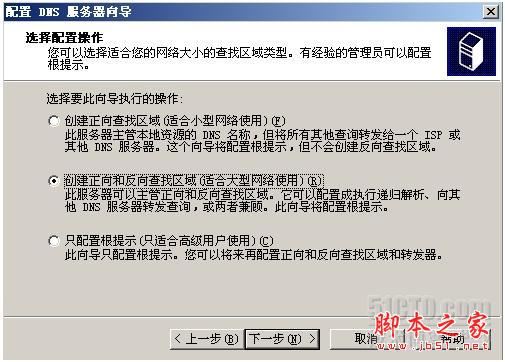 3 選擇【創(chuàng)建正向和反向查找區(qū)域(適合大型網(wǎng)絡(luò)使用)】-----【下一步】