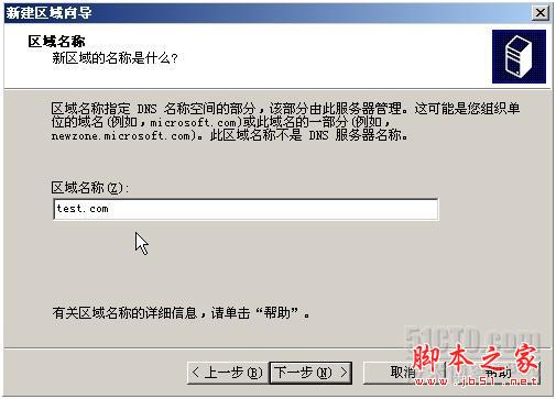 6 填入?yún)^(qū)域名稱 (如果網(wǎng)絡(luò)中的服務(wù)器要使用的完整域名是“www.test.com”,則在區(qū)域名稱中填入“test.com”)