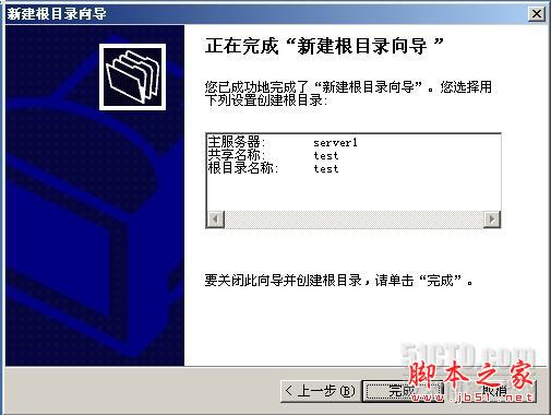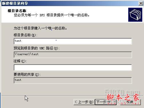 注:改圖下面的“要使用的共享”一項的內容是“test”,表示DFS根目錄要使用該服務器上的共享文件夾“test”