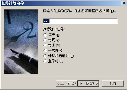 2.開始-》設置-》控制面板-》任務計劃 添加任務計劃 下一步 瀏覽 找到net.bat 選擇計算機啟動時