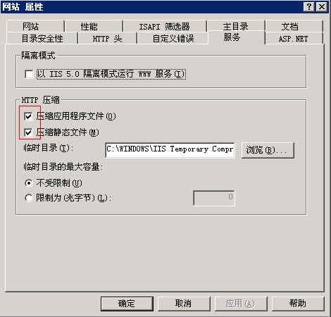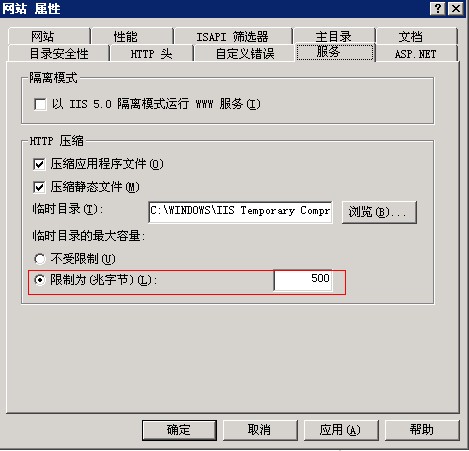 壓縮后的緩存文件會存放在C:/WINDOWS/IIS Temporary Compressed Files 因此建議在IIS--網(wǎng)站--屬性--服務(wù),設(shè)置一個大小,避免C盤被占滿了。如圖: