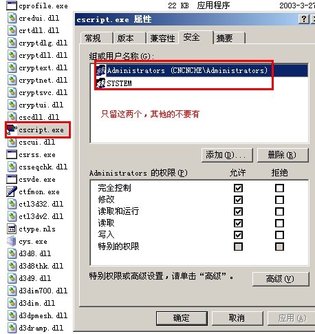 2、【cscript.exe解決辦法】 在C:/WINDOWS/system32找到cscript.exe,右擊屬性,選擇屬性框中的“安全”,建議修改權限,刪除所有的用戶只保存Administrators 和SYSTEM為所有權限。如下圖