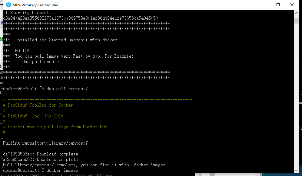 7.拉取一個鏡像:由于國外的docker hub速度特別慢,這里介紹個https://www.daocloud.io,將主機接入后可以方便的拉取各種鏡像,并且速度很快