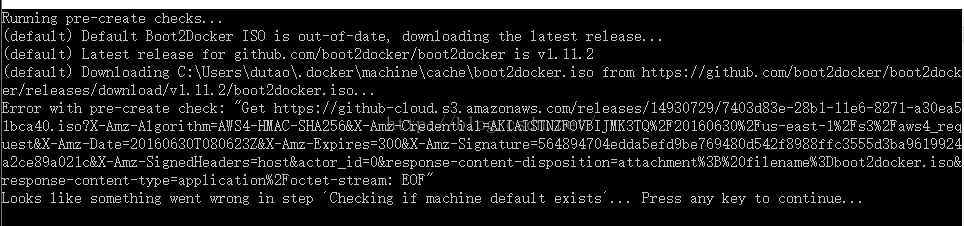 4.打開terminal后進行running pre-create checks,顯示boot2docker iso過期需要下載,但由于眾所周知的原因下載速度會很慢,最終導致報如下的錯誤: