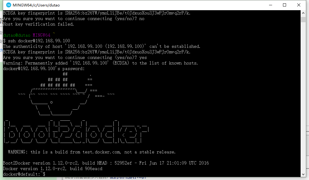 8.利用SSH工具管理,在windows命令行進入docker后,不能復制,而且操作也不方便,因此用支持SSH的工具來管理是很好的,比如SECURECRT, PUTTY等,輸入ifconfig查詢docker地址,默認為192.168.99.100賬號密碼為:docker/tcuser