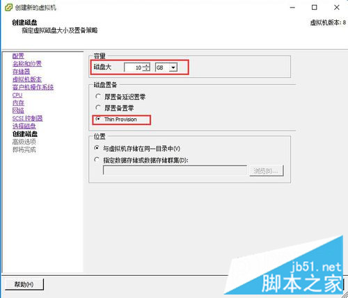 進入“創建磁盤”界面,設置磁盤容量及磁盤置備,建立選擇“Thin Provision”選項,因為此選項是動態增長磁盤空間,不像后置備是在磁盤創建時就固定磁盤空間大小然后點擊“下一步”按鈕。