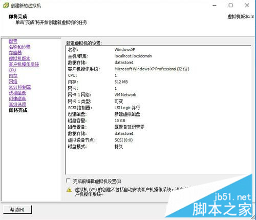 進入“即將完后”界面,查看一下新建虛擬機的設置,然后點擊“完成”按鈕即可完成了創建虛擬機的配置。
