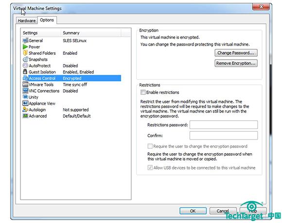 圖1. VMware Workstation訪問控制鏈接用于配置虛擬機的加密及限制選項