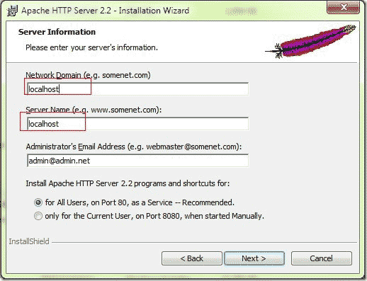 運行 Apache 2.2 安裝包, 在安裝過程可以設置域名、服務器名稱和端口,Apache的默認端口為80。