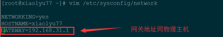 復(fù)制代碼 代碼如下:[root@xiaolyu77 ~]# vim /etc/sysconfig/networkNETWORKING=yesHOSTNAME=xiaolyu77GATEWAY=192.168.31.1 #網(wǎng)關(guān)地址,同物理主機(jī)的網(wǎng)關(guān)地址