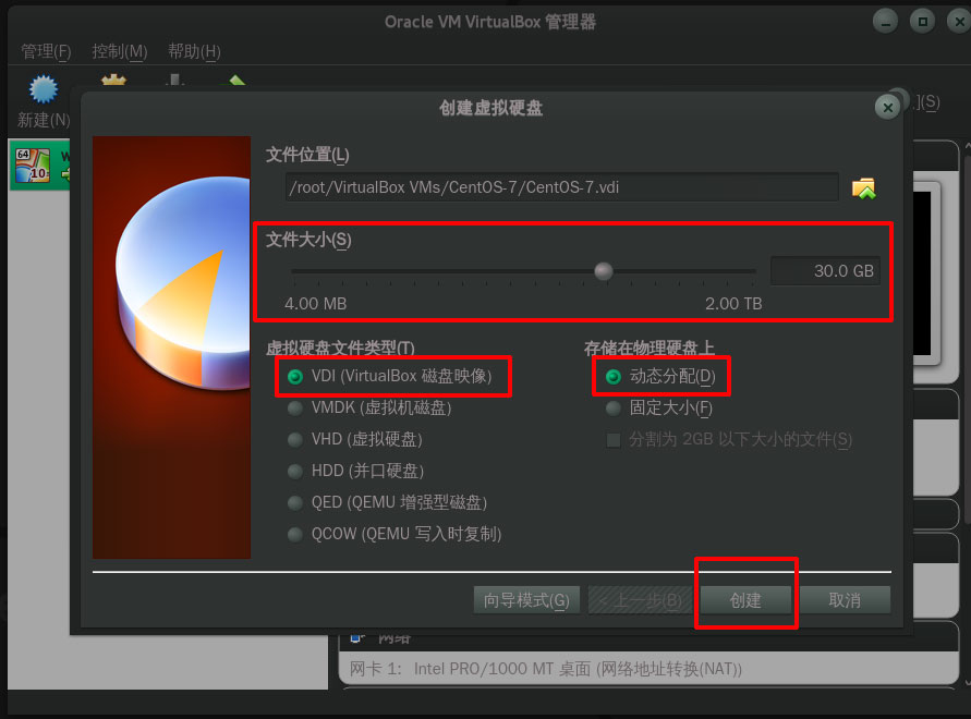 文件位置就是你虛擬機創建后存放的位置,linux默認放在用戶家目錄里,windows默認放在系統盤,如果空間足夠,默認就好。不夠,點擊右邊的文件夾圖標可以更換位置。文件大小就是分配給虛擬機的硬盤空間的大小,我這里給CentOS-7分配30G的硬盤。虛擬硬盤文件類型選擇VDI,存儲在物理磁盤上有動態分配和固定大小。區別是,動態分配會根據你硬盤空間的使用情況來動態分配硬盤多少。固定大小則是你分配多少硬盤,就一次性從硬盤上劃出多少空間給虛擬機,相應的真實機硬盤就減少多少大小(有網友說固定大小,性能要好一點)。然后點擊創建。