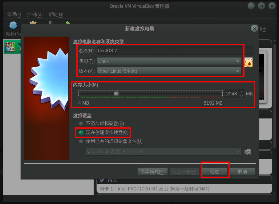 在名稱哪里填入CentOS-7,類型選擇linux,版本選擇other或者redhat。如果cpu是64位的,就選擇64位版本,否則就選擇32位版本的。內存大小的選擇不要超過真實機內存的一半大小,我這里分配2G大小。勾選上 現在創建虛擬硬盤,點擊創建。