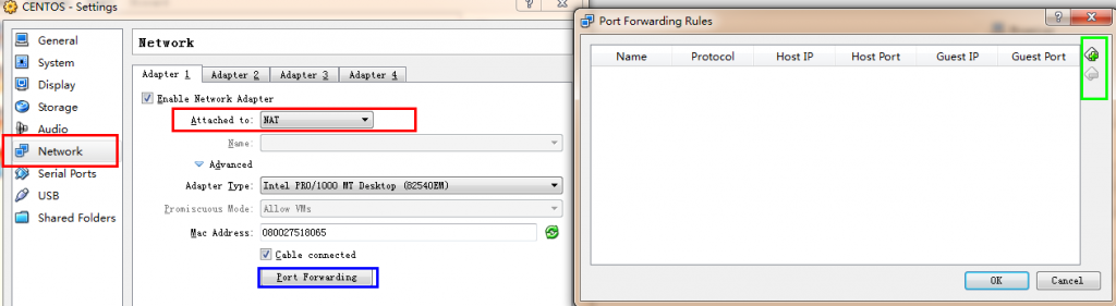 但并不是宿主主機沒有方法訪問虛擬主機,我們的VirtualBox就提供了一種Port Forwording(端口轉(zhuǎn)發(fā))方式訪問虛擬主機。點擊如下圖綠色標記的按鈕可進入設(shè)置界面設(shè)置要訪問虛擬主機的實體網(wǎng)絡(luò)中的主機(包括宿主主機)。