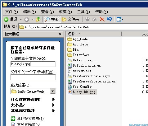 原理:在Windows中要搜索多個文件是使用分號(;)進行分割的,如果這個文件本身帶有分號怎么?- -。哈哈系統就不能搜索這種文件的!下圖,明明有這個h.asp;kk.jpg這個文件,在Windows搜索中會被當成h.asp和kk.jpg這兩個文件來搜索,這是Windows的一個設計不當,應該說不應該讓分號(;)做文件名的!