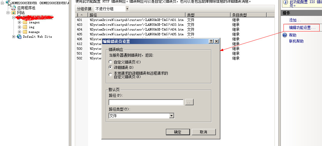 2. <網(wǎng)站>-錯誤頁-操作-編輯功能設(shè)置,選擇“詳細(xì)錯誤信息”