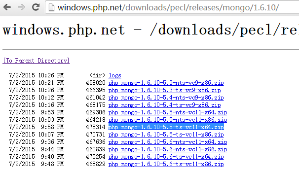一般來說,官網的資料是最新和最全的,推薦到官網去下載。下載地址是:http://windows.php.net/downloads/pecl/releases/mongo/。我選擇的是1.6.10版本的
