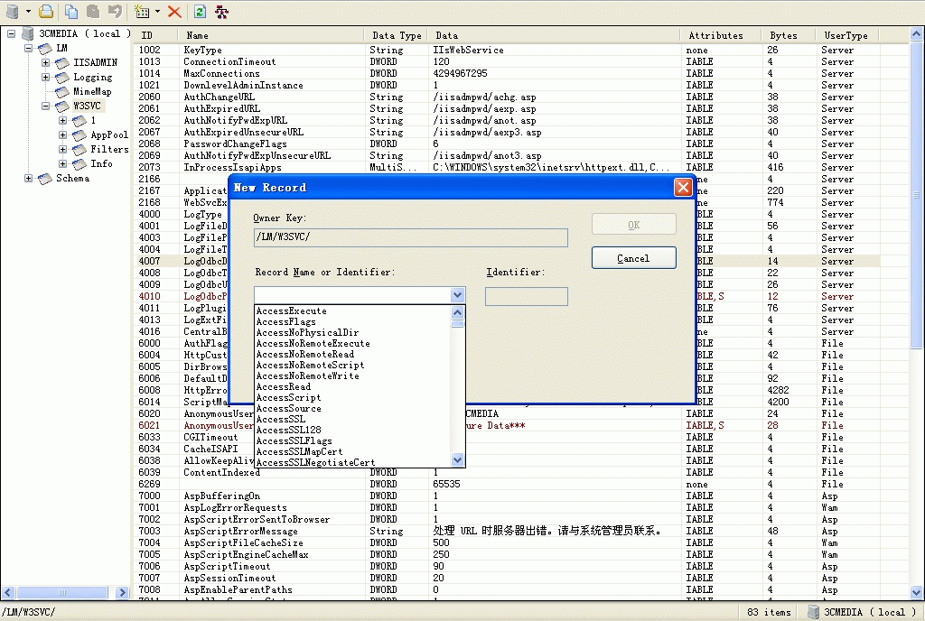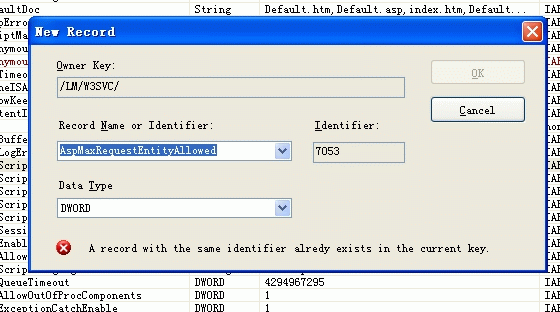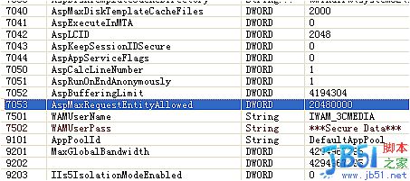 第五步: 修改(local)/LM/W3SVC/AspMaxRequestEntityAllowed屬性,修改為較大的值,如1G: