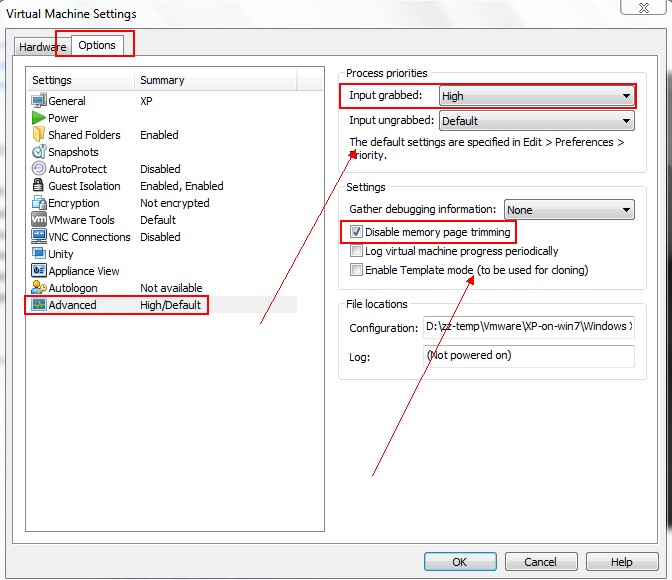 Disablememory page trimming: 這步很關(guān)鍵,一定要點上,否則虛擬機會把物理內(nèi)存中的一些數(shù)據(jù)同步到硬盤上去,聽到虛擬機運行的時候內(nèi)盤狂叫了吧?讀硬盤是虛擬機慢的主要原因。