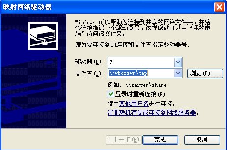 接著啟動進入客戶機Windows XP,打開"我的電腦",依次點擊菜單欄"工具"-"映射網絡驅動器",驅動器盤符自選,文件夾填"http://vboxsvr/tmp",tmp是我之前設置的"數據空間名稱",把tmp改成你剛才設置的"數據空間名稱"即可,如下圖: