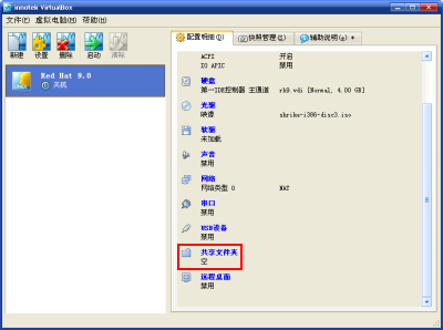 首先,在Windows上運行VirtualBox。如圖,選擇“Red Hat 9.0”,再選“共享文件夾”。