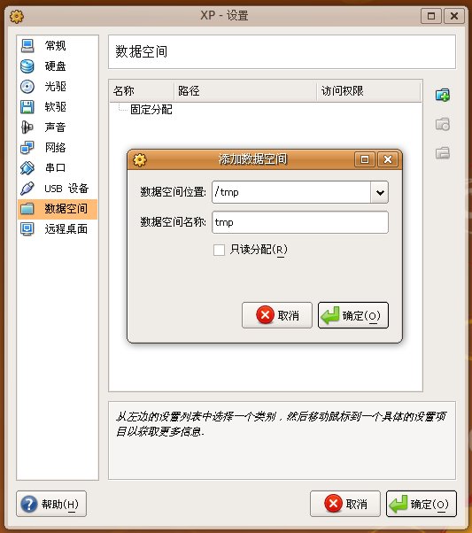 接下來就是設置共享目錄了。在VirtualBox先選擇你的虛擬系統,接著"設置",選"數據空間",點擊那個加號按鈕,如下圖: