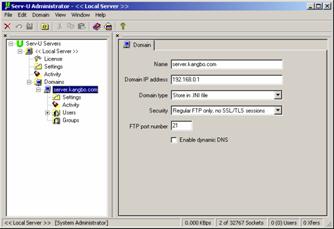 下載Serv-U應(yīng)用程序后,執(zhí)行ServU4004.exe,并根據(jù)提示逐步安裝。安裝完成后不需要重新啟動計算機,用戶就可以直接選擇“開始”→“程序”→“Serv-U FTP Server”→“Serv-U Administrator”命令啟動應(yīng)用程序,并進行簡單設(shè)置。下面我們以當(dāng)前計算機(IP地址為192.168.0.1,域名為server.kangbo.com)為例,建立FTP服務(wù)器。