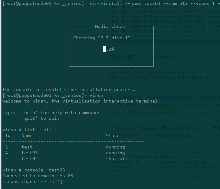 virt-install --name=test03 --ram 512 --vcpus=1 -f /data/kvm_centos/centos6.7_03.qcow2 --location /data/soft/CentOS-6.7-x86_64-bin-DVD1.iso --graphics vnc,listen=0.0.0.0,port=5987, --network bridge=br0 --extra-args='console=tty0 console=ttyS0,115200n8 serial' --force --autostart
