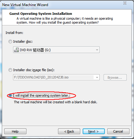 接下來到了選擇安裝源這一步,選擇第三項“I will install the operating system later”(我以后再安裝操作系統)