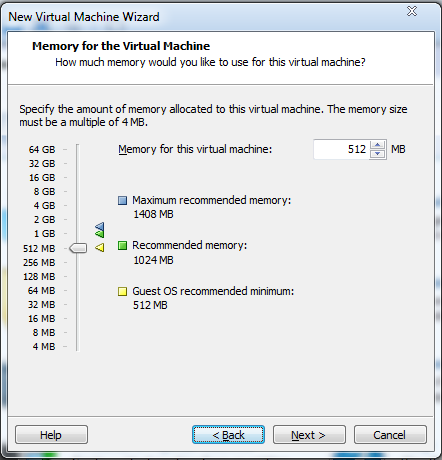 設置虛擬機的內存,這個根據需要設置即可,一般推薦的值就可以了(2G內存的機器,虛擬內存最好不要大于700MB,否則會很卡)