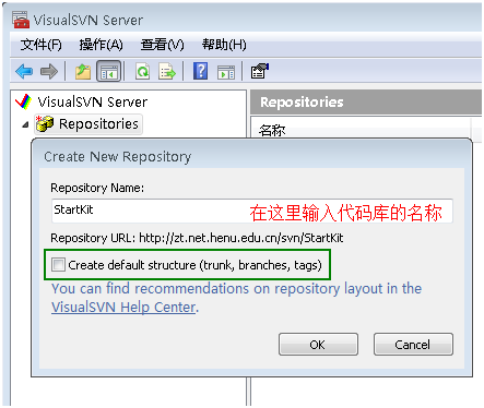 注意:上圖中的CheckBox如果選中,則在代碼庫(kù)StartKit下面會(huì)創(chuàng)建trunk、branches、tags三個(gè)子目錄;不選中,則只創(chuàng)建空的代碼庫(kù)StartKit。