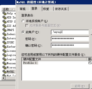 在運行里輸入Services.msc回車打開服務面板,找到Mysql服務點右鍵屬性,點登陸,登陸身份以你新建的Mysql用戶登陸輸入:./帳號名,輸入密碼,點確定然后應用重啟Mysql服務即可。